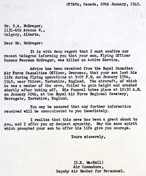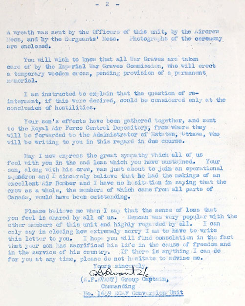 He had a brother and two sisters (his brother Robert served in the RCAMC). Duncan was working as a clerk for the Southern Alberta Dairy Pool when he enlisted into the RCAF