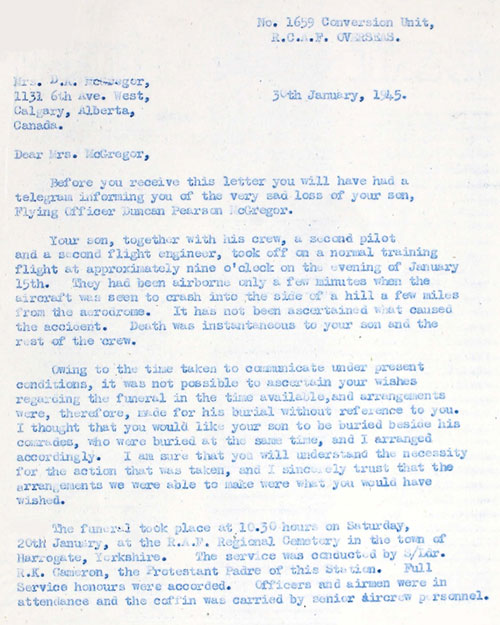 F/O Duncan McGregor was twenty years old and was buried at Harrogate Stonefall Cemetery, Yorkshire on 20th January 1945.