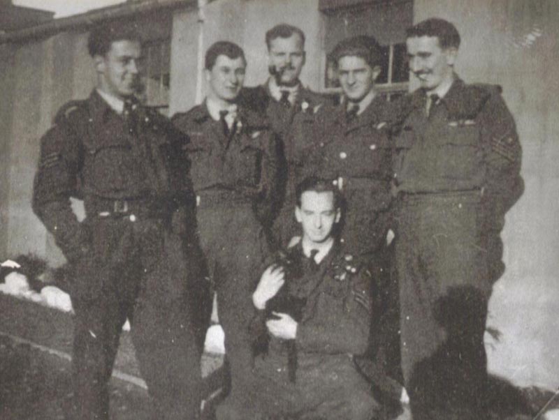 This photograph shows the original Walton crew, taken at 19 OTU before they were joined by the flight engineer. Left to right - Bob May, Willie Wilson, Bruce Perry, Bill Falconer, Geoff Walton and in front is Derek Lanning holding the cat Chunky! Their positions were as follows..