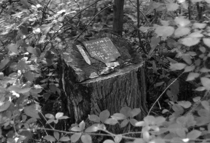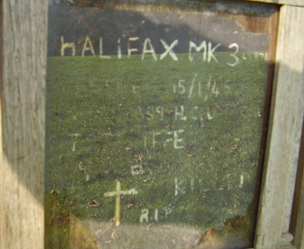 Longtime Felixkirk resident Mrs Dorothy Almond was one of the first to reach the crash site as a sixteen year old girl, she would create a painted slate and place this at the crash site in later years. This would become the first memorial to be erected at the site. This slate, although faded is still at the crash site but is now housed in a wooden mount to protect it from the weather. The photo above shows the slate as it was in the 1980's (photograph by Mr Eric Barton). Whilst I have no reason to doubt this information I was contacted some years to say the engraver was a Mr Roger Miller (or Roger Wade Perry). The photograph shown below shows the slate housed behind perspex making it difficult to photograph (in 2009) shown below (photograph credit to me, Rich Allenby).
