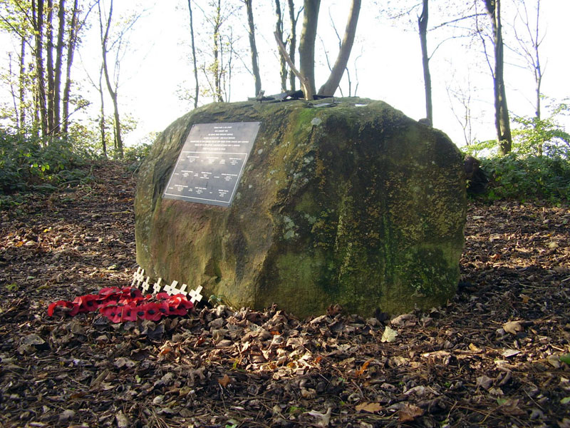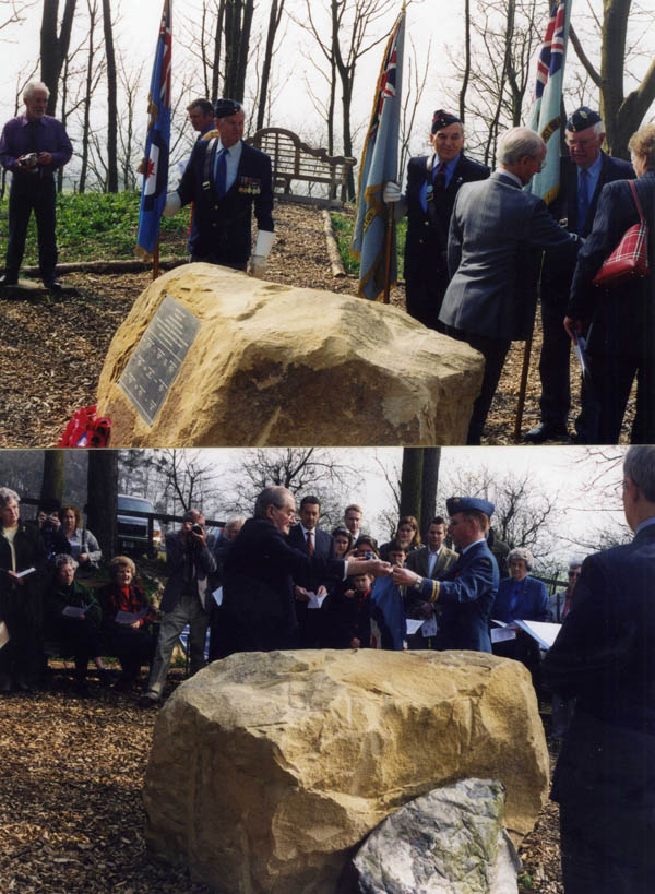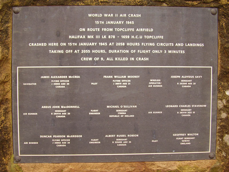 On 29th March 2003 a large memorial stone, plaque and bench were dedicated at the crash site in a well planned ceremony. Three Beagle Pup aircraft from nearby Bagby airfield and a Hurricane based at Breighton near Selby, took part in a flypast. Wreaths and poppies were also laid in front of the stone in memory of those who lost their lives in the accident. This memorial came about through the efforts of businessman and the landowner Mr Ken Blundell. Having learnt of Mrs Almond and her dedication to the site he funded the memorial himself as a thank you to Canadians who had been kind to him during his RAF training during the War. Mr Ken Blundell sadly died in just over a year after the memorial dedication but his son Christopher Blundell now lives and owns the land on which the aircraft crashed. The efforts of aviation historian Mr David Thompson should not be overlooked in the dedication day, through his work the family of Sgt O'Sullivan were able to attend the memorial service. Also in attendance was Mr Derek Lanning who had been a member of Geoff Walton and Richard O'Sullivan's original crew. Mr Lanning had attempted to trace Geoff Walton's family but sadly learnt that Geoff's sister has died a year previously.
