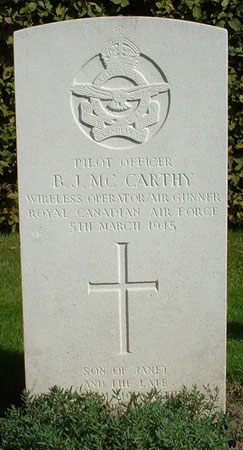 Wireless Operator / Air Gunner - P/O Benedict Joseph McCarthy RCAF (J/94463), aged 27, of Glace Bay, Nova Scotia, Canada. Buried Harrogate Stonefall Cemetery, Yorkshire (H/P/3).