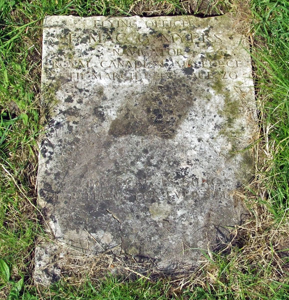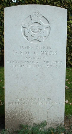 Navigator - F/O Frank MacGregor Myers RCAF (J/39365), aged 20, of Dauphin, Manitoba, Canada. Buried Harrogate Stonefall Cemetery, Yorkshire (H/P/17).