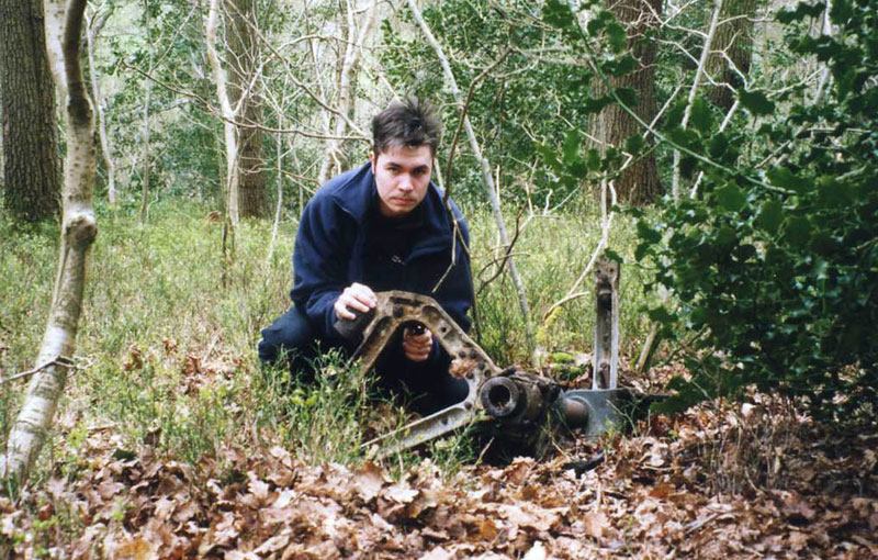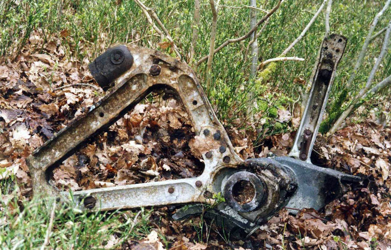 In April 2004 I searched the woodland to the west of the crash site and located a large piece of the aircraft's undercarriage in the undergrowth.