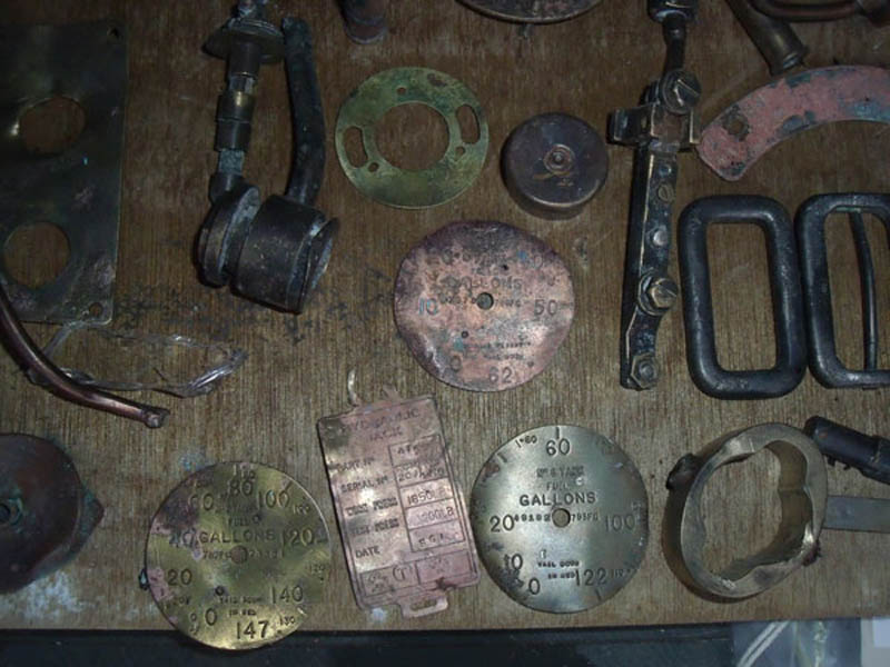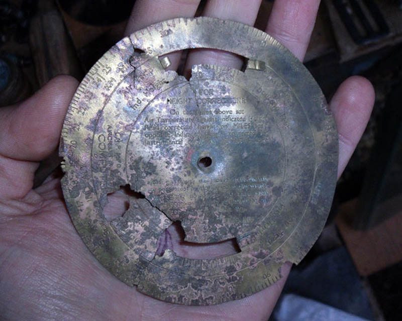 A number of plates and other interesting items from this aircraft photographed in Ken Ward's collection. Above is the bezel from the Navigator's Dalton Computer and below are various plates, instrument faces, buckles, the morse-key tapper and a fired Verey cartridge case.