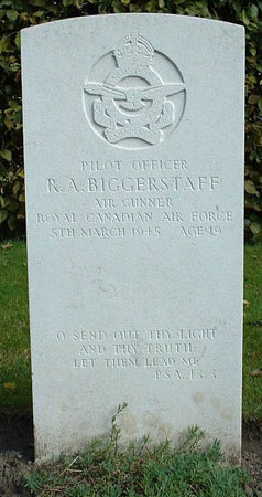 Rear Gunner - P/O Richard Alan Biggerstaff RCAF (J/95425), aged 18 (or 19?), of Brandon, Manitoba, Canada. Buried Harrogate Stonefall Cemetery, Yorkshire (H/P/13).