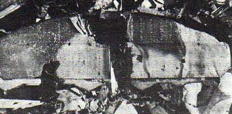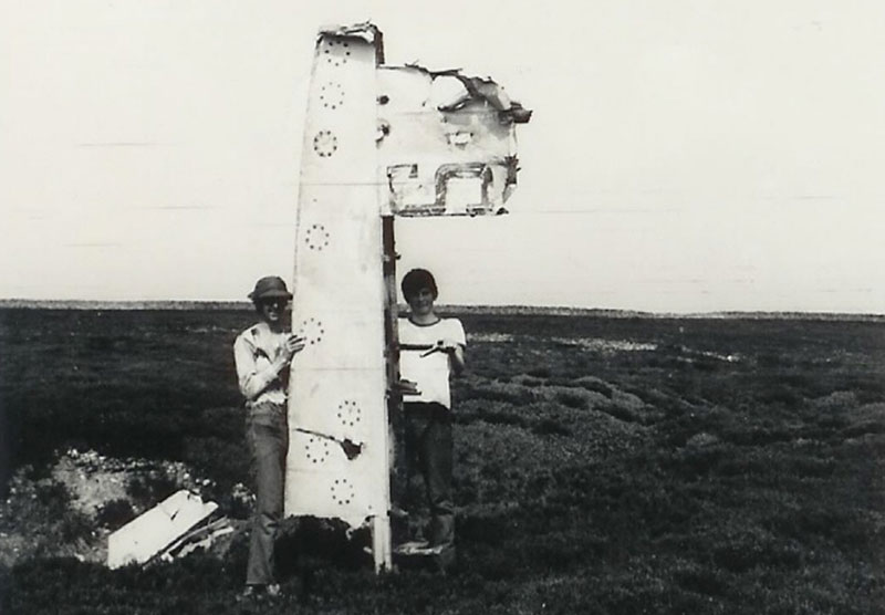 Mr Chris Hattersley and Mr Alastair McFarlane hold up a large wing section prior to the site being cleared around 1972.