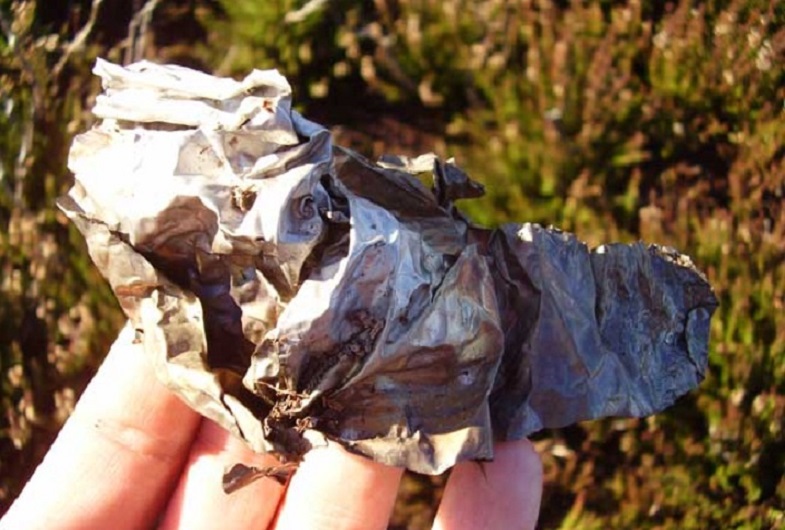 I began searching for this crash site way back when my interest developed in the late 1990s. I was told about the incident as a child by my grandmother who lived in Helmsley but with no real indication of where it actually crashed. The moor is a huge area to begin to search without any real indication of where to look. Even so, after various visits to generally walk across different parts of the moor searching for any sign of it, one piece was found by John Skinn in 2007. It would subsequently transpire that this is not the crash site though is almost certainly from the aircraft. This photograph above shows this items and while it resembles a piece of plain silver foil, which does, on this photograph look similar to a Kitkat wrapper, it is infact much thicker and stiffer and is made from stainless steel with signs of bluing by heat.
