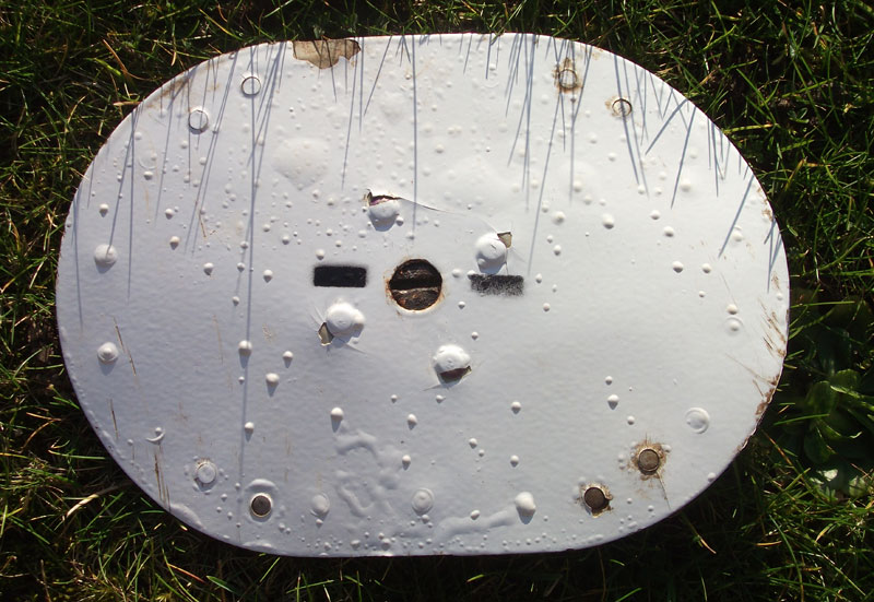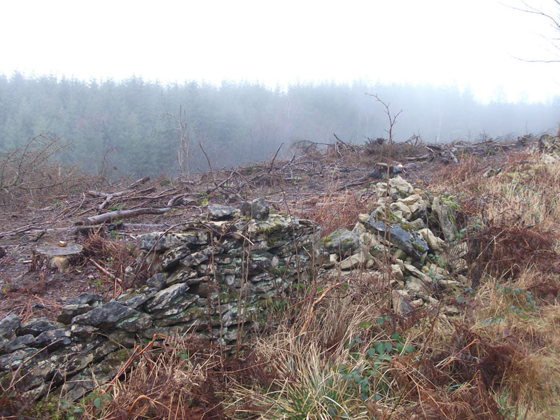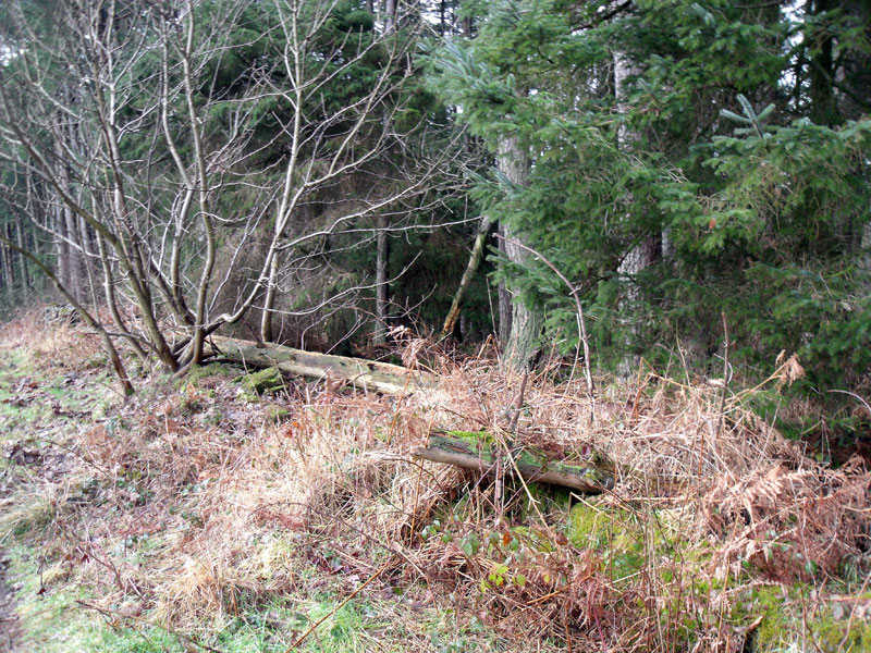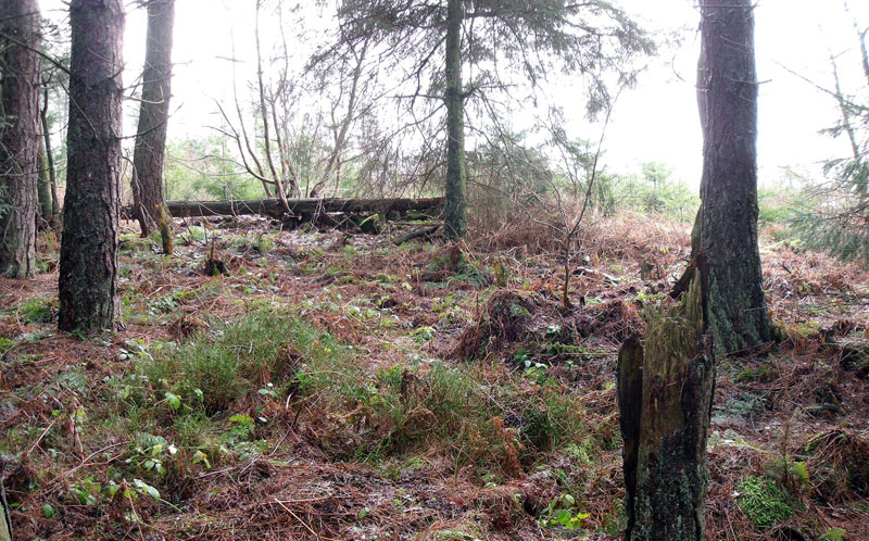 The woodland was clear-felled in 2013 and I returned to the site in January 2014 to see if I could spot anything on the surface now there was more light available. I located a few pieces of the aircraft and also numerous tiny fragments of coloured paint in the soil.