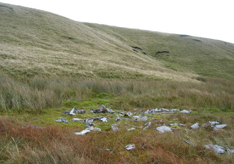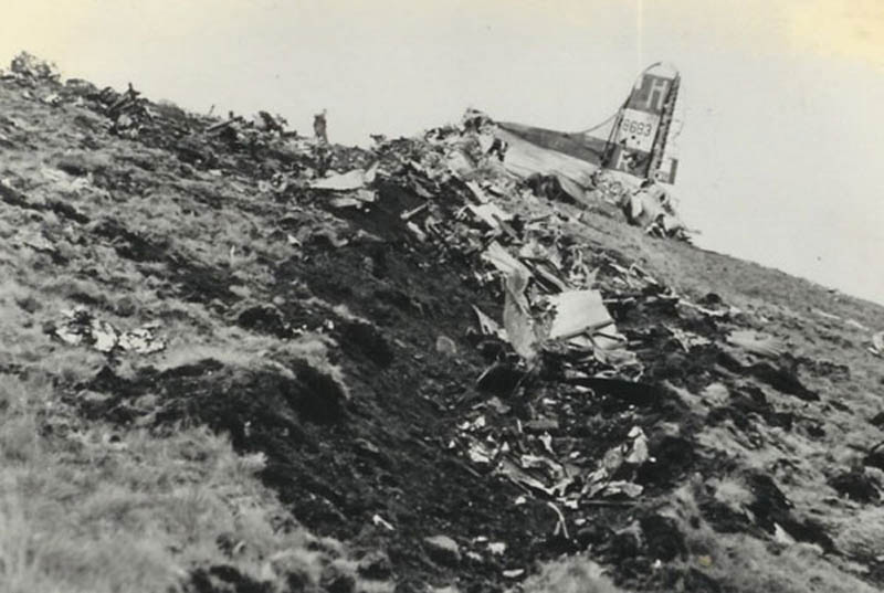 On 17th May 1945 this B.17 Flying Fortress took off from Knettishall, Suffolk for a thousand mile night-navigation training flight with a crew of five airmen and as the war had just ended no air gunners were being carried on board. The aircraft belonged to the 561st Bomb Squadron, part of the 388th Bomb Group, USAAF. The route the crew were intending to fly was to have been from base to Newcastle, then down to Lands End and back to base. On the second leg from Newcastle to Lands End the aircraft struck the side of Great Whernside whilst flying in cloud, the impact was some way down the hillside and the aircraft ploughed its way up hill breaking up. Sadly all five airmen on board were killed when the front of the aircraft was totally destroyed. The tail section remained reasonably intact and upright on the hillside as is shown in the photograph below.