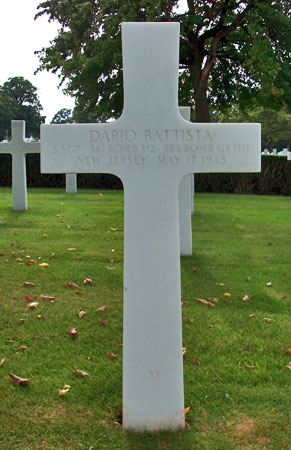 Wireless Operator - S/Sgt Dario Battista USAAF (32453589), aged 27. Of Somerset County, New Jersey, USA. Buried Madingley Cemetery, Cambridge (F/4/33).