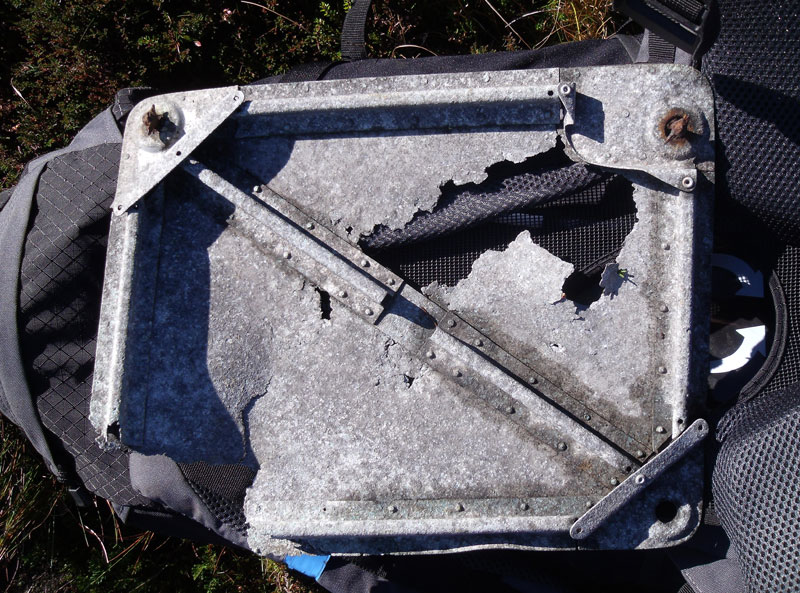 A complete detachable access panel, as seen from the rear, is still at the crash site but in a poor condition.