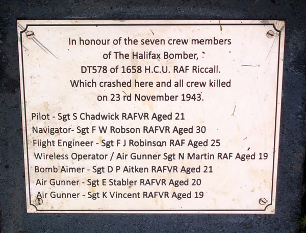 At 23.27hrs on 23rd November 1943 the crew of Halifax DT578 took off from their base at Riccall near Selby, Yorkshire for the exercise and headed towards St.Bees Head on the north-west coast, from there the turning points of the exercise were to have been St.Abbs Head, Hexham, Sleaford and Northampton, then return to base. The major problems occurred for the aircraft because of the severe weather over the Pennines. The weather conditions consisted of severe turbulance, poor visibility, upto gale Force 8 winds with torrential rain and icing conditions occurring at 4000 feet above the ground. At just before midnight an aircraft was plotted by the Royal Observer Corps near Kettlewell, in Upper Wharfedale, to be flying low and heading in a southerly direction, it was then heard circling and possibly trying to gain height. Soon after an aircraft was heard in a dive from which it did not recover, it was later found that Halifax DT578 had crashed into Great Whernside killing all on board. The RAF's AM Form 1180 suggested that both DT578 and JB926 could have collided causing both aircraft to have crashed but this was later ruled out in the full AIB investigation as the crew of Halifax JB926 had transmitted their position to have been near St.Bees Head at the time Halifax DT578 crashed and therefore neither could have been involved a collision over Yorkshire, and neither were the aircraft involved in collisions with the other 1658 Heavy Conversion Unit aircraft in the air.