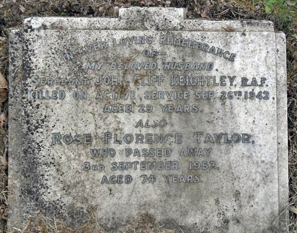 Wireless Operator / Air Gunner - Sgt John Cliff Keightley RAFVR (1202833), aged 29. Buried Wealdstone Cemetery, Harrow, Middlesex.