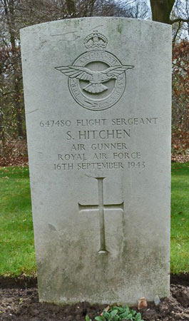 Samuel Hitchen suffered a broke back and was badly burned but he recovered and was able to return to flying some time later and joined the squadron known as the 617 "Dambuster" Squadron. He was sadly killed serving with 617 Squadron on 16th September 1943 when Lancaster EE130 crashed near Ibbenburen. He is buried in Reichswald War Cemetery. He was F/Lt R A F Allsebrook DSO DFC's rear gunner. I thank Mr Graham Sharpe for the photograph of his gravestone.