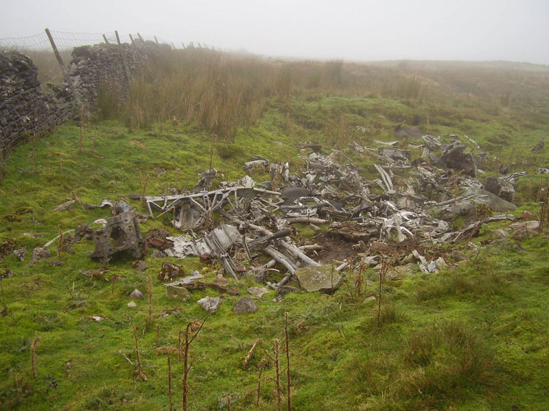 At 14.20hrs on 28th May 1945 this 17 O.T.U. aircraft took off from base at either Turweston or Silverstone (sources vary) for a training flight. Flying north they missed their turning point due to thick cloud and having flown on became lost. They reduced their height to try and locate their position but in doing so struck the ground on Bycliffe Moor, near Gill House about two miles east of Conistone in Upper Wharfedale. Sadly the crew were all killed instantly in the crash which occurred at 15.50hrs. The severely damaged state of the wreckage would suggest that the aircraft was loosing height repaidly when it crashed.
