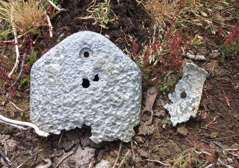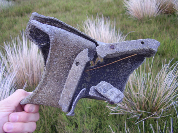 These fragments were found in 2013 some distance from the main collections of wreckage and they seem too large to have been wind-blown or carried by sheep wool over the years so are probably there-abouts in situ from 1941. The photograph above shows a rocker cover from a Bristol Mercury engine, this type of engine powered this variant of Blenheim.