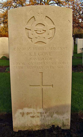 Navigator - F/Sgt Keith Innes Gove RCAF (R/203035), aged 21, of Toronto, Ontario, Canada. Buried Harrogate Stonefall Cemetery, Yorkshire.