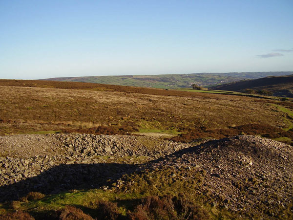 My wife Caroline and I searched for the crash site in December 2006 but found nothing on this trip but I have learned that small fragments were found some years ago among old mine workings thought to be contained in the area of this photograph by air historians Ken Reast and Eric Barton. The bits located by the mine workings could well be what is left of where the wreckage was piled up at the edge of the moor prior to being carted away. The crash site may as a result be slightly higher up the moor. It has also been suggested that alot of the wreckage was thrown down some old mine workings by the RAF clear-up party to get rid of it.