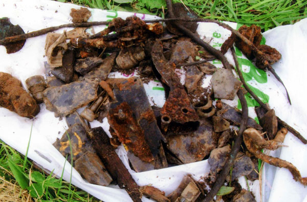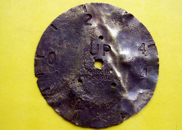 In Summer 2012 air historian Mr Ken Reast set about locating this crash site and found a witness to the collision in Hudswell who directed him to the field and to the farmer of the land Mr Harrison of Hudswell. I went with Ken on his first trip to the field to be shown where the aircraft crashed, but long grass in the field hampered a field walk of the site to try and pin point it. We did however roughly mark the location for a later return when the grass was either cut or ploughed. In May 2013 Ken, Eric Barton and Albert Pritchard received the permission from the farmer to visit and they returned to find the site. I had received an invitation to an aircraft memorial dedication on the same day elsewhere so was unable to attend. They found a few small fragments of the aircraft in a confined area which confirms the aircraft as having crashed in this field. One small find was an instrument face from the Rate of Climb Indicator shown below. My thanks to Ken and (the now late Albert Pritchard) for the photographs shown on this page.