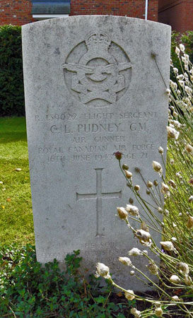 Clinton Landis Pudney was born on 20th September 1922 and was the son of Herbert Eugene and Katherine Anna (nee Bennett) Pudney at Oneonta, New York State, USA but the family later moved to Pelmar, Buffalo, New York, USA. He had two sisters and their father died in May 1933. As a young man he worked for Curtis Wright Corporation in their aviation division as an airframe mechanic. He enlisted into the RCAF at Hamilton, Ontario, Canada on 25th October 1941. Following his initial training in Canada arrived in the UK on 6th November 1942, he reported to 1659 Heavy Conversion Unit on 20th December 1942. After taking time to recover from his injuries sustained in the accident detailed above he completed his training and was posted to 405 Squadron who were based at Gransden Lodge. By 8th April 1943 he had completed at least four operation flights. On 16th June 1943 Halifax HR832 in which he was flying crashed after being struck by lightning near Clifton Farm, Kings Lynn, Norfolk during a routine training flight. Again Clinton Pudney pulled his crew from the burning aircraft and then again he walked two miles for help. Sadly all his crew died and he eventually succombed to the injuries he had sustained. He had only been notified that he was to receive the George Medal for the first crash three days before this second accident and it is doubtful that he was presented with it by the time he died. He is buried at Sutton Bridge Cemetery, Norfolk and was only twenty one years old. This researcher would suggest his actions on the day he died were of a similar degree of gallantry to those displayed in Yorkshire. At the time of his death the George Medal was not awarded posthumously so this probably accounts for why he was not recommended for a Bar to the George Medal.