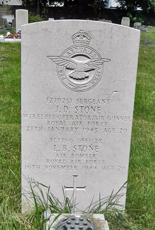 Wireless Operator / Air Gunner - Sgt John Dennis Stone RAFVR (1270251), aged 20. Buried Mitcham Road Cemetery, Croydon, Surrey.