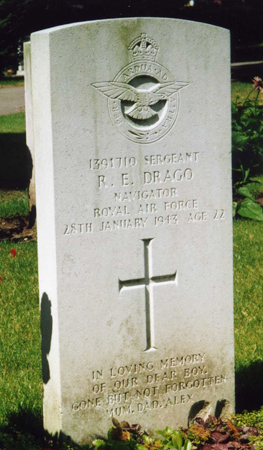 Richard Drago was born on 23rd November 1920 at Willesden, London and was the son of Edward Henry and Louisa Matilda (nee Brack) Drago. He had an older sister. He enlisted for RAF service on 4th June 1941 and his mother appears to have been living at Bromley, Kent at the time. He was buried at Ripon Cemetery, Yorkshire.
