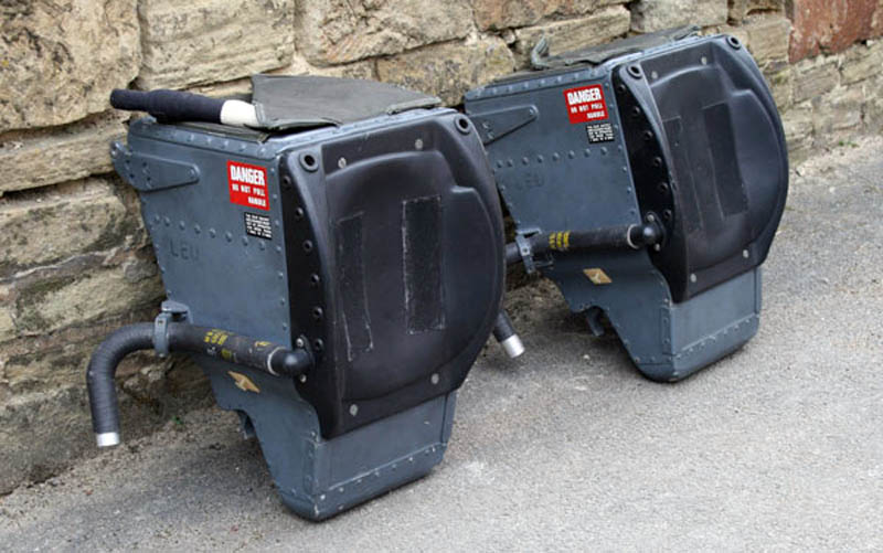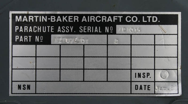 Various parts of this aircraft found their way into a surplus store in Darlington, via a scrap yard in Thirsk from RAF Leeming where the wreckage was recovered to. The items pictured above were bought by Mr Andy Hunter and show both parachute containers from Tornado ZE858 used in the ejections. The makers plate shown below is on one of these containers. My thanks to Mr Hunter for supplying these photographs. ZE858 was the first Tornado that 25 Squadron received on 15th December 1988 before being transferred to 43 Squadron.
