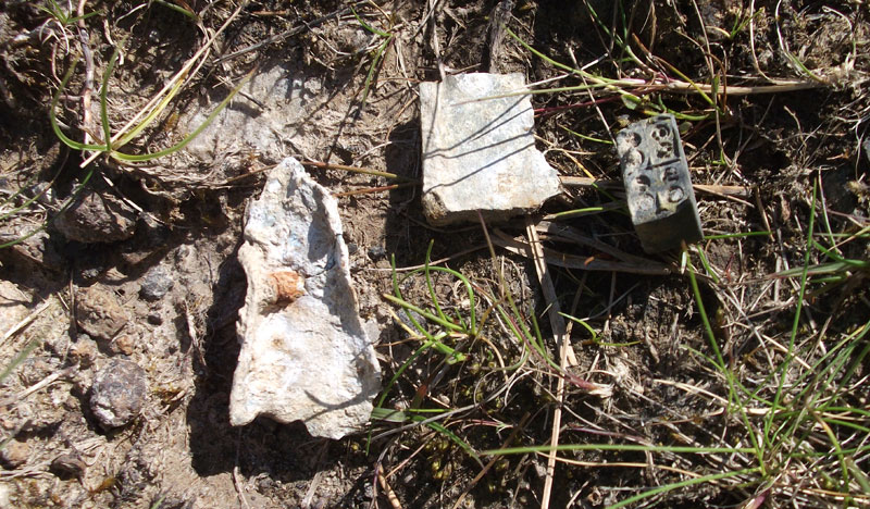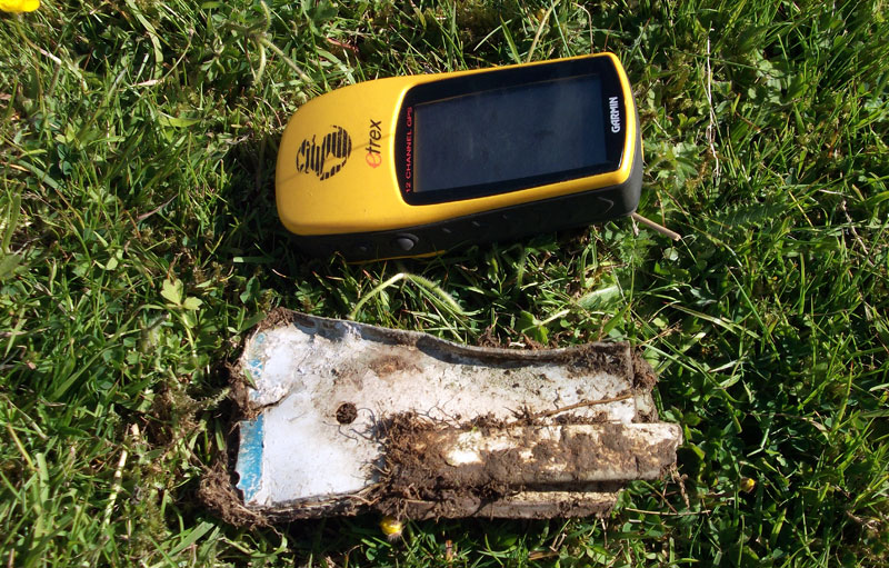 The deep crater created by the crash was backfilled but a few small fragments of the aircraft can still be seen on the surface where the grass had not fully recovered.