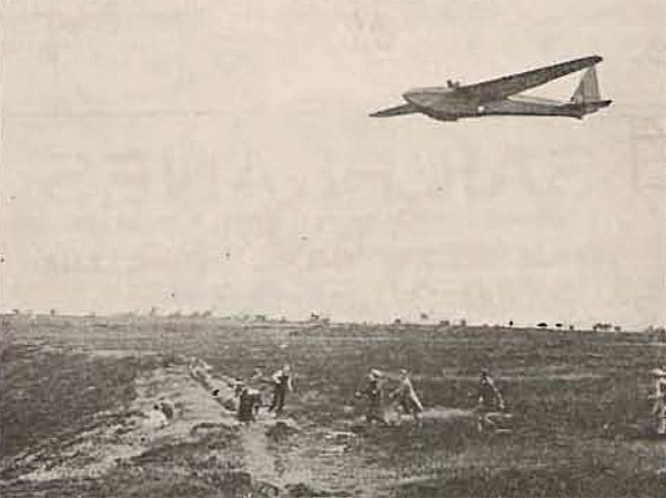 Another attempt at the endurance record was the made a few days on Monday, 25th July 1932 but the group did not have enough people to assist with the launch so resorted in stopping cars on the Thirsk road to ask if people could help, they ended up trying to launch with just five men on each of the bungees and this time farmers, road workers, motorists and walkers were asked to help! The glider flew at around 500 feet and rose to 800 feet but after four hours flying the wind dropped and a landing had to be made on the landing ground fearing a forced landing in the fields below. The photograph above shows the Tern taking off at Sutton Bank for this flight (photograph Sailplane and Glider magazine). Later they launched the Tern again but did not have enough people to hand to man the bungees, the glider did not have enough speed to take off and it struck a fence post hidden in heather on take-off at the Sutton Bank gliding site. The glider sustained damage to the fuselage and any further flights were called off. The Tern was transported back to the Airspeed factory in York where repairs were carried out.