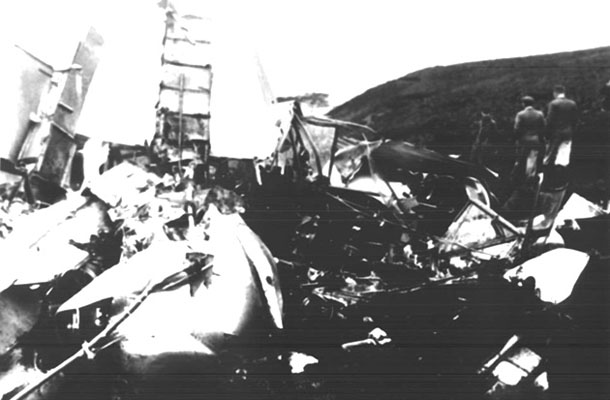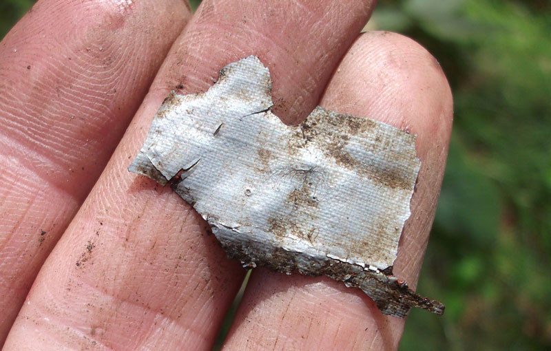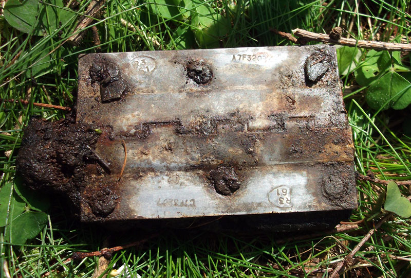 This small piece of silver painted fabric (shown left) was found at the crash site in May 2014 and comparing it to same fabric (shown right) on the piece below picked up at the crash site soon after it crashed it shows how preserved this fragment was in 2014. The fragment shown on the right was picked up at the crash site soon after the crash and was kept, the photograph was kindly provided by Mr Tony Johnson formerly of Guisborough.
