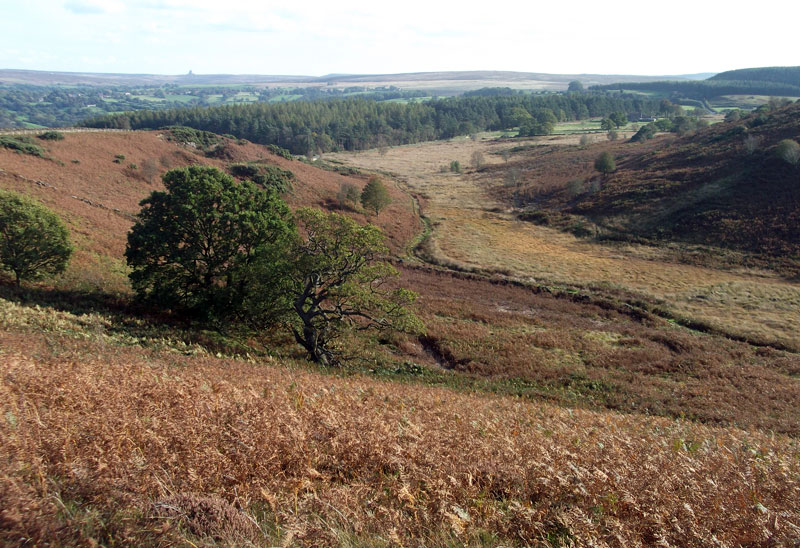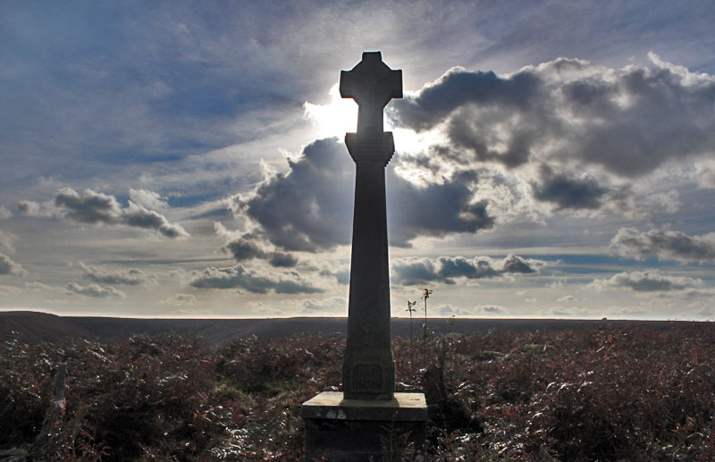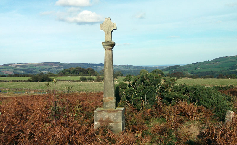 In 1929 Mr John Kenneth Foster J.P. of Egton Manor arranged for a cross to be erected close to the crash site. Although not visible in my photograph it is inscribed "KF 1929". It was built from local Egton stone by Mr R Harrison of Ashley House, Glaisdale and the cross itself was sculpted by Mr J W Hill of Whitby. "Swinsty Cross", as it is known, stands close to the spot where the Longhorn crashed but was apparently not erected on this site intentionally. It is a copy of a cross found near Vittel, Vosges, France originally designed by Sir E L Lutyens A.R.A.