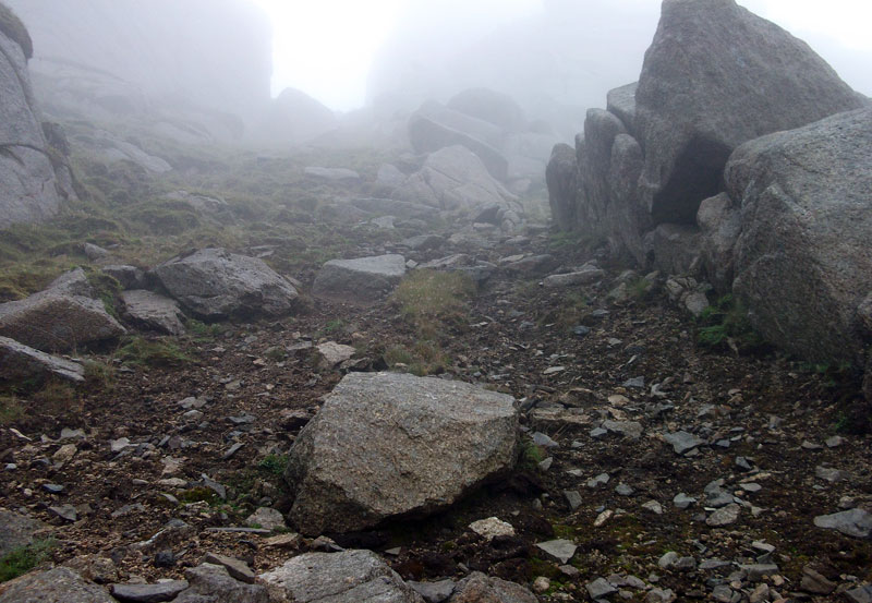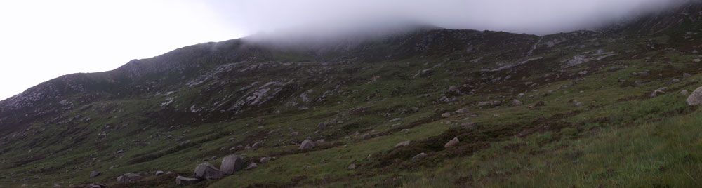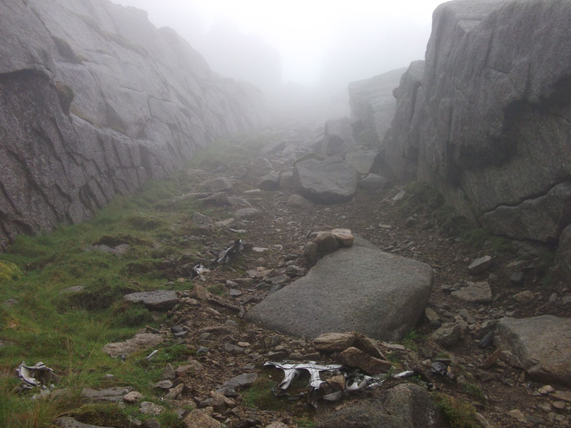 I visited the crash site in July 2014 in poor weather and as a result the photographs shown here are not as great I would have hoped for. The three aircraft that crashed on Beinn Nuis are shown on this photograph; the Lodestar crashed in the cloud on the right, the B17 crashed in the centre on the rockface just in the cloud and the B24 crashed over the horizon on the left but wreckage from it is scattered down the hillside on the left of this photograph.