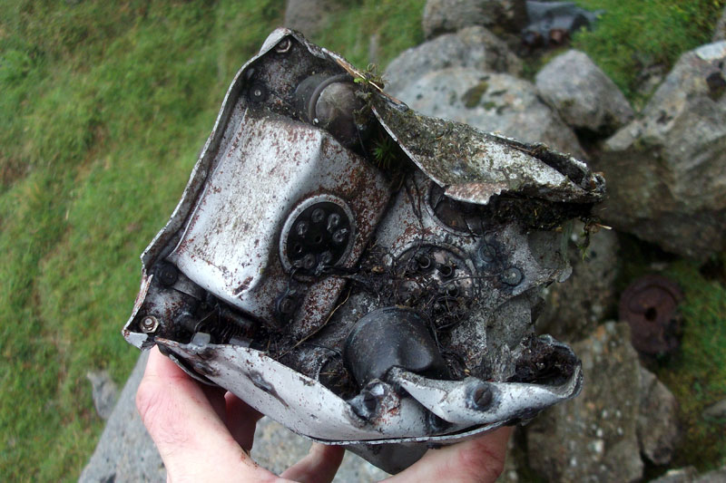 An unidentified piece of electrical equipment with the remains of valves inside the same unit shown below. Parts of one of the engines can be seen in the background of the bottom photograph.