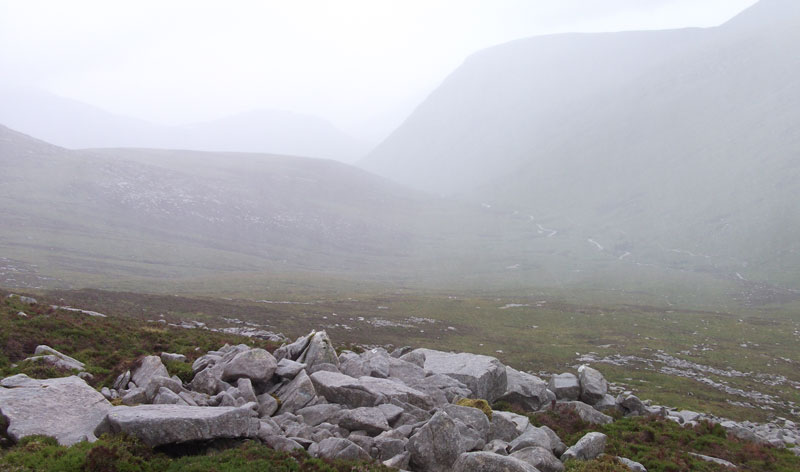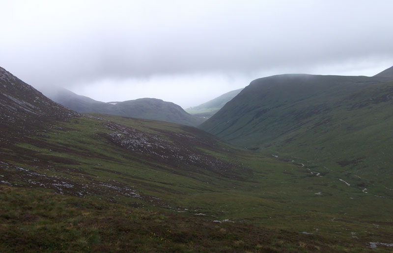I visited this crash site in very poor weather in July 2014 and later climbed Beinn Bhreac to get general photographs of the crash site but due to the weather I could not see the site from that side of the glen so these photograph show the Gleann Diomhan and the area of the crash from the head of the glen looking north.