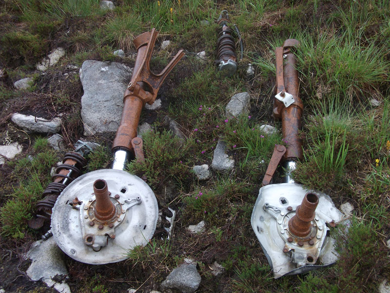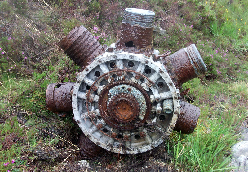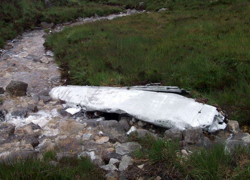 The Chesapeake was mainly used as a training aircraft by the Royal Navy and on 22nd July 1943 the crew of this aircraft were undertaking one such training flight out of their base of HMS Landrail at RNAS Machrihanish when the aircraft flew into low cloud. The aircraft struck the side of Beinn Tarsuinn on the west side of Gleann Diomhan, towards the north of the Isle of Arran and the two crew flying in the aircraft were killed. Little of the aircraft appears to have been removed from the crash site at the time and much of the wreckage was dumped in a watery gully below the crash site. A display on air crashes on Arran in the Heritage Museum in Brodick shows a photograph of a military helicopter credited lifting a large wing section from this crash site in more recent years but it appears to be the same wing section still at the crash site when I visited in 2014.
