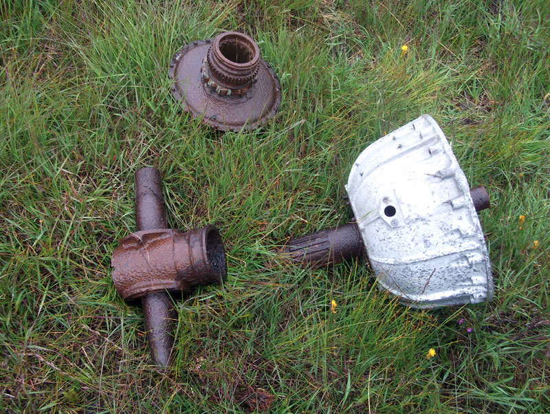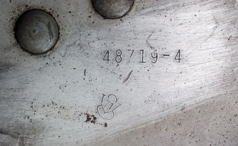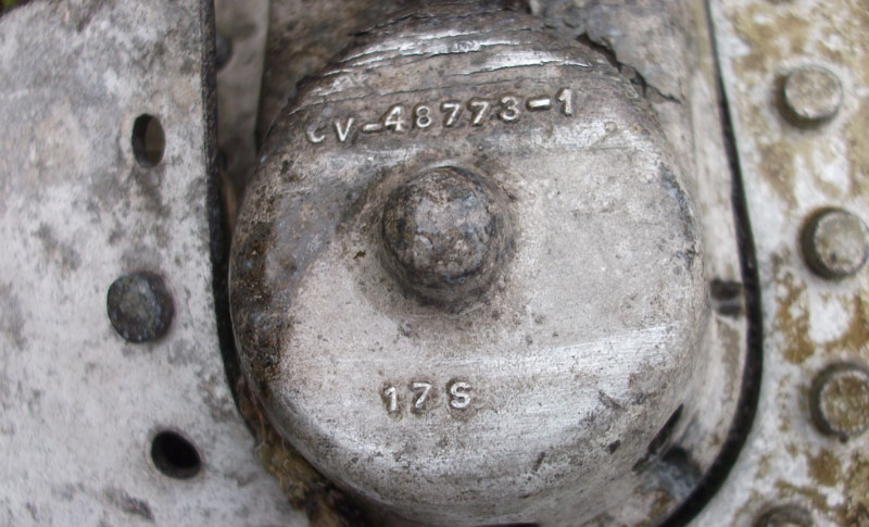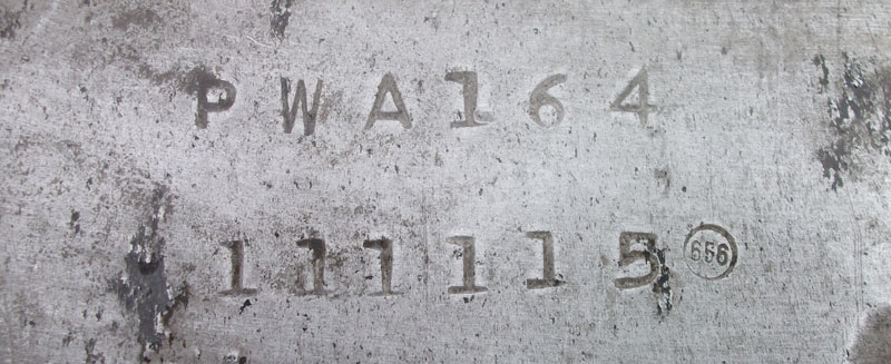 The main Pratt and Whitney R-1535 Twin Wasp engine block (above) with a part number (below) found on both the block and on the reduction gear casing which could be the engine number. Part of the engine which was located between the main part of the engine shown above and the reduction gear casing was not found during my visit to the crash site in July 2014 but it could well be buried at the site. The engine appears to have been deliberately broken up when the site was "cleared".