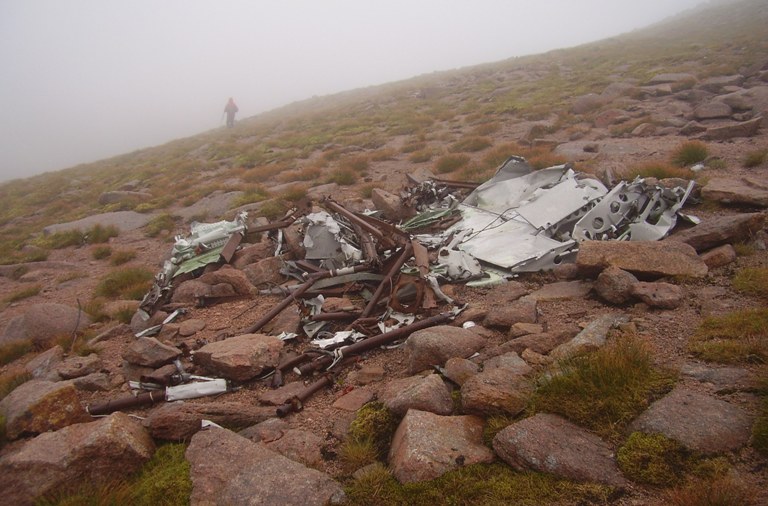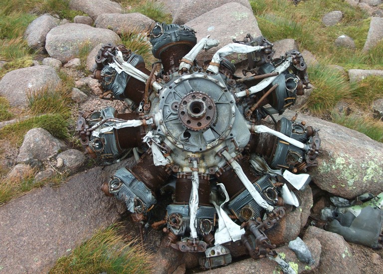 I visited the crash site in August 2011 with Will Lund as part of a long walk from the Sugar Bowl near Glenmore Lodge over Braeriach and Cairtoul and out to the Linn of Dee. The weather was poor as I climbed Braeriach and combined with needing to carry on with the long walk meant that my time at this crash site was limited. It is known through searching other websites that a lot more wreckage of the Blenheim is to be found much lower down the mountain into the Lairig Ghru but because of the time and effort it would have taken to locate this wreckage and climb directly up out of the Lairig Ghru from there it was deemed not physically possible on my visit. We did however locate what was probably the main crash site area and a scattering of wreckage as the same altitude as well as one of the two engines. All was in good condition.