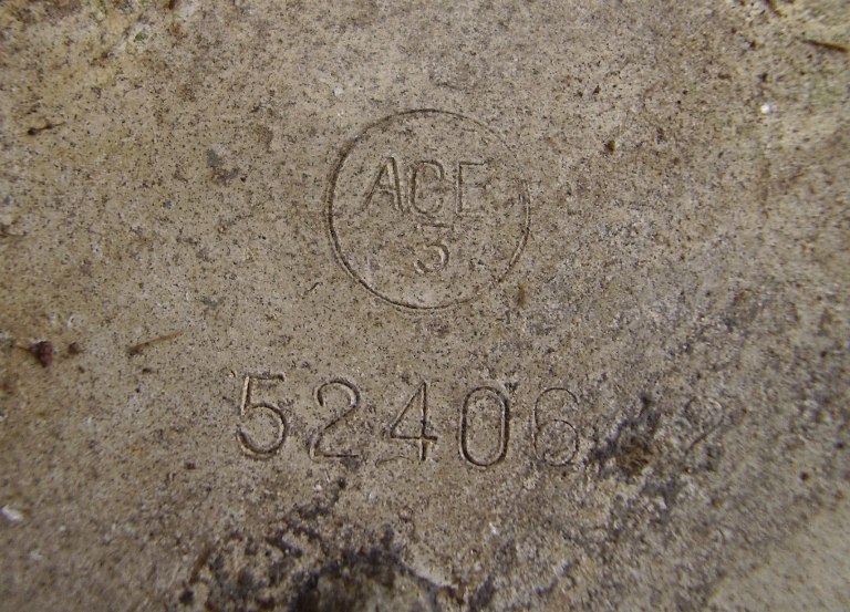 A second piece of the aircraft containing a part number and an inspection stamp different to the typical Rootes ones. A number of pieces at the site show this "ACE" stamp but its meaning at the time of creating this webpage is not yet known.