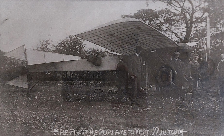 following this attempt on the ground and were soon on the scene to repair the plane, a new strut was fitted at Norton and the aircraft attempted to take-off again at 16.00hrs the same day to continue the attempt at flying to Leeds, unfortunately a tyre burst and the take-off was not carried out. By 17.00hrs the tyre was repaired and it took off successfully and cleared Malton but a few minutes later the engine began to play up again so the pilot landed again on land near Star Cottage Farm, in Welham Park, only two miles from the first landing and called off the flight to Leeds for the day. The aircraft was taken apart and transported back to Filey by train. The photograph shown above is of the Blackburn Mercury at Malton on this date but it is unclear where the photograph was taken, ie after the first or the second of the landings.