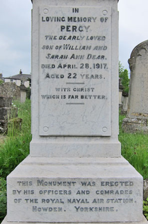 Engineer - AM1 Percy Dear RNAS (F/5426), aged 22, of Clive Vale Nursery, Impington, Cambridge. Died 28th April 1917, buried Histon Road Cemetery, Cambridge.