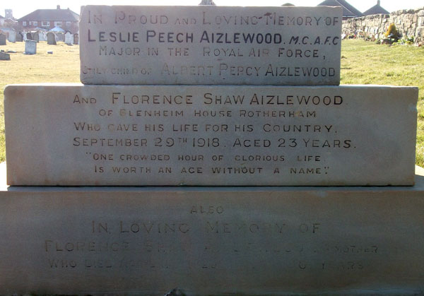 Pilot - Major Leslie Peech Aizlewood MC AFC RAF, aged 23. Buried Old Marske Churchyard, Yorkshire.