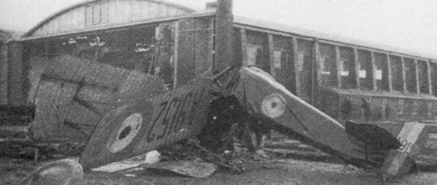 The events that surround the photograph of this crashed aeroplane are unclear. The widely published photograph and copied notes states that the Spad VII A9152 flew into a hanger roof at Driffield aerodrome while making an approach to land on the aerodrome site, it then crashed in front of the hanger. The pilot was with No.21 T.D.S at the time. The date of 11th and 19th November 1918 is quoted but I am reasonably certain that both dates are incorrect.