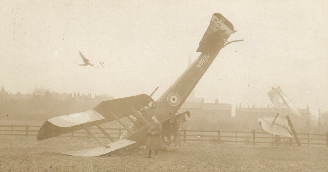 During the afternoon of Tuesday, 19th November 1918 this aeroplane was to be flown from the manufacturers Pegler Brothers and Co. at Doncaster to join No.9 (Newcastle) Aircraft Aceeptance Park at Newcastle. The route from Doncaster probably saw pilot head roughly west to pick up railway lines, following then north. Owing to thick fog the pilot headed west from Doncaster but then became lost. Eventually he descended and narrowly missed Ossett's Holy Trinity Church. The aeroplane then struck a telegraph pole with a wing and crashed into a field nearby. Off Wesley Street, Ossett is quoted. Fortunately the pilot escaped serious injury but the aeroplane was badly damaged.