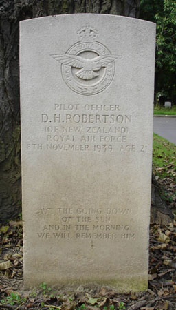 P/O Robertson's gravestone in Thornaby Cemetery. As an Acting Pilot Officer on probation he was graded as Pilot Officer on probation with effect from 3rd September 1939, this appointment was confirmed with effect from 6th October 1939. He was from Westport, Nelson, New Zealand.