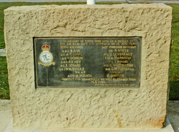 The main force, now around thirty aircraft, were seen to fly west towards Garton on the Wolds then they turned back towards Driffield airfield to make their attack from the north-west, presumably so they could then fly straight out to sea. They attacked Driffield airfield at around 13.20hrs and the attack lasted for around 45 minutes with them dropping around one hundred bombs on the aerodrome and the surrounding area with further bombs falling near Southburn village. Ten aircraft sustained damage resulting in all of them being written off. There was also damage sustained to four of the five hangers, the living accommodation and other buildings. In total fourteen people lost their lives as a result of this enemy action at Driffield; thirteen were military personnel and one civilian also died. Fourteen military personnel and two civilians were detained in hospital for treatment with five other RAF personnel being slightly injured. Pretty much all of those killed were Yorkshiremen. Fifty years after the incident a memorial was placed at the airfield entrance. Those who lost their lives as a result of Driffield being attacked were..