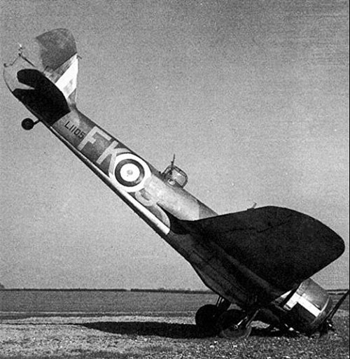 On 4th May 1940 this 219 Squadron aircraft ran onto soft ground on landing at Scorton airfield and tipped up onto its nose as can be seen on the photograph below.