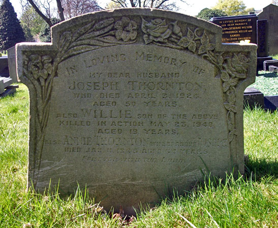 Wireless Operator / Air Gunner - AC1 Willie Thornton RAF (625669), aged 19, of St Helens. Buried St Helens Cemetery, Lancashire.