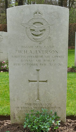 Sgt William Everson was killed on 11th October 1941, he was still serving with 106 Squadron and was flying in Hampden AE144 when it crashed in Germany on Ops to Essen. He was still only twenty years old and is buried in Reichswald Forest War Cemetery.