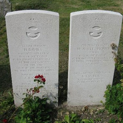 All of the airmen listed above were sadly killed just days after their landing at Staxton Wold, when, on 15th August 1940, Whitley P5044 struck barrage balloon cables over Eastleigh, Hampshire while their aircraft was making for base of Driffield after Ops to Bordeaux. All are buried locally at Fawley churchyard. The photograph showing some of their graves was found on the internet.